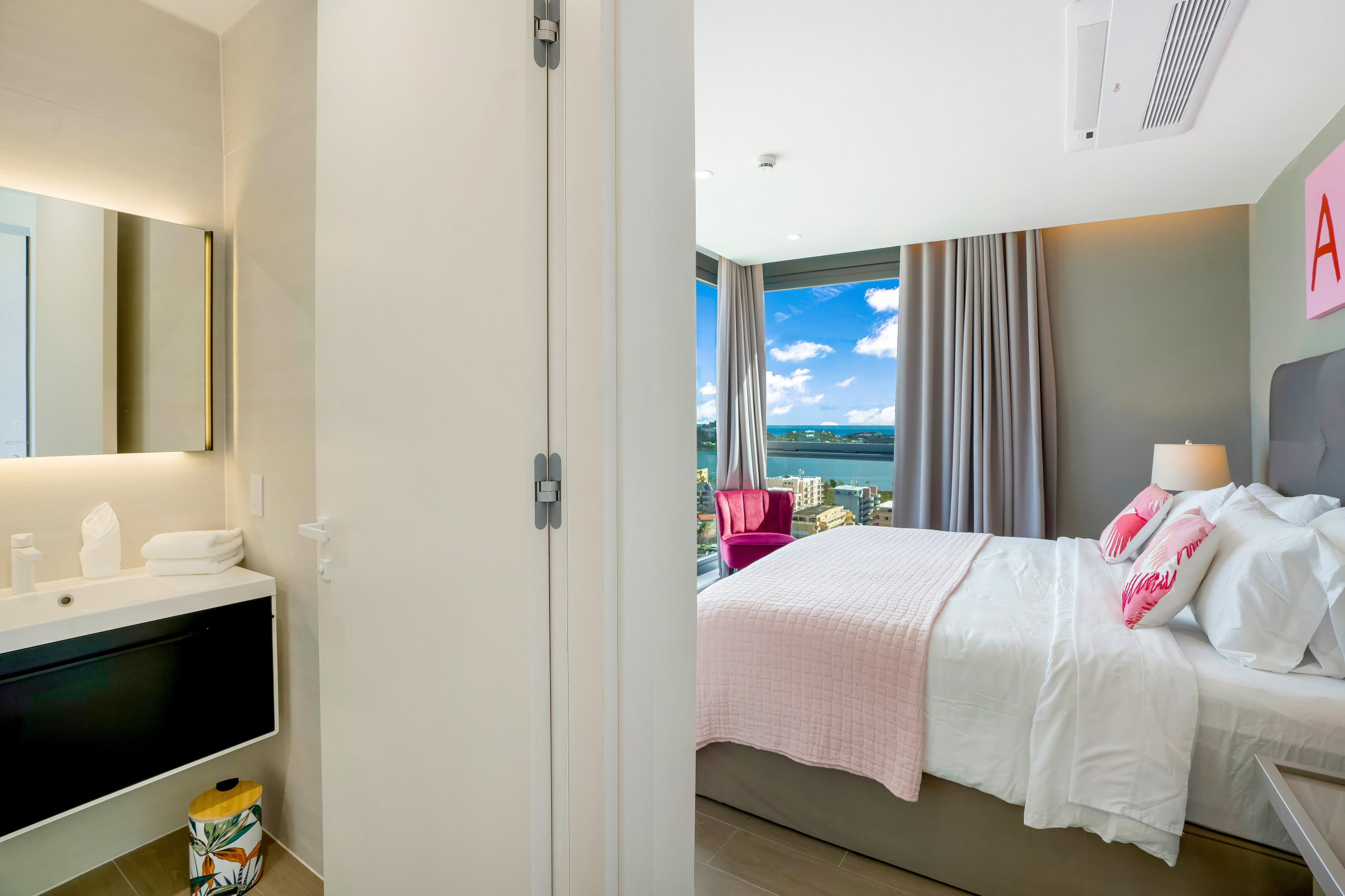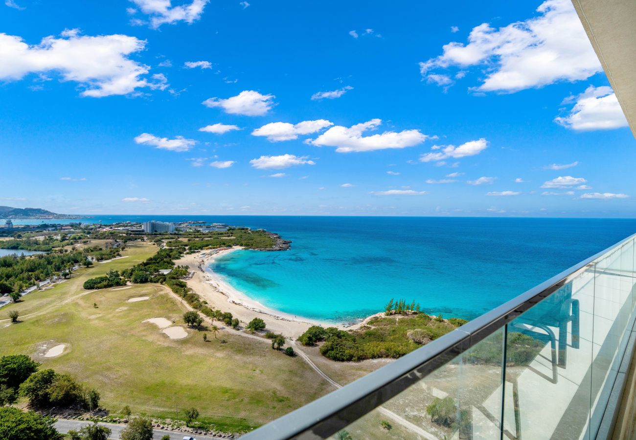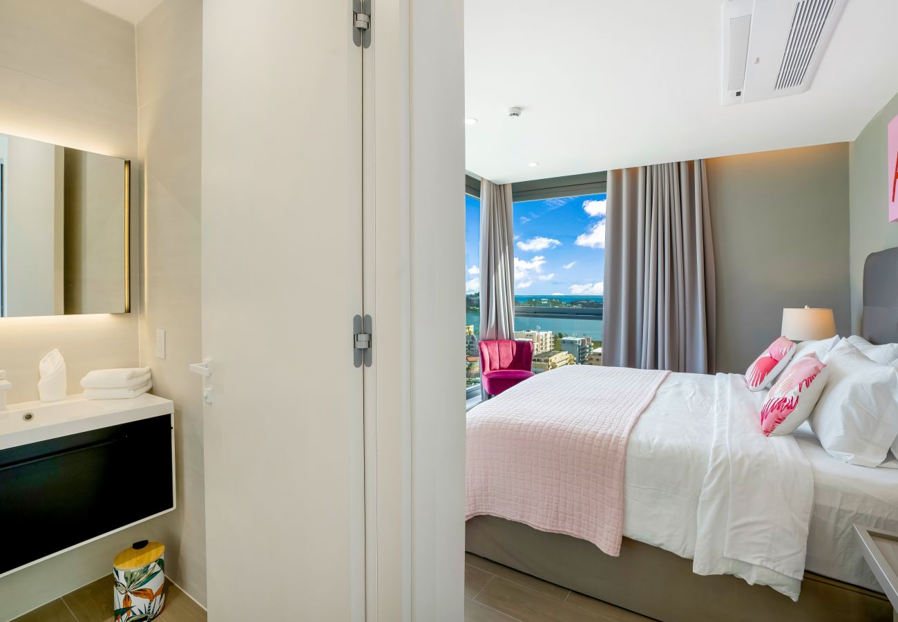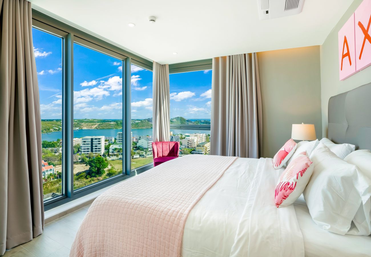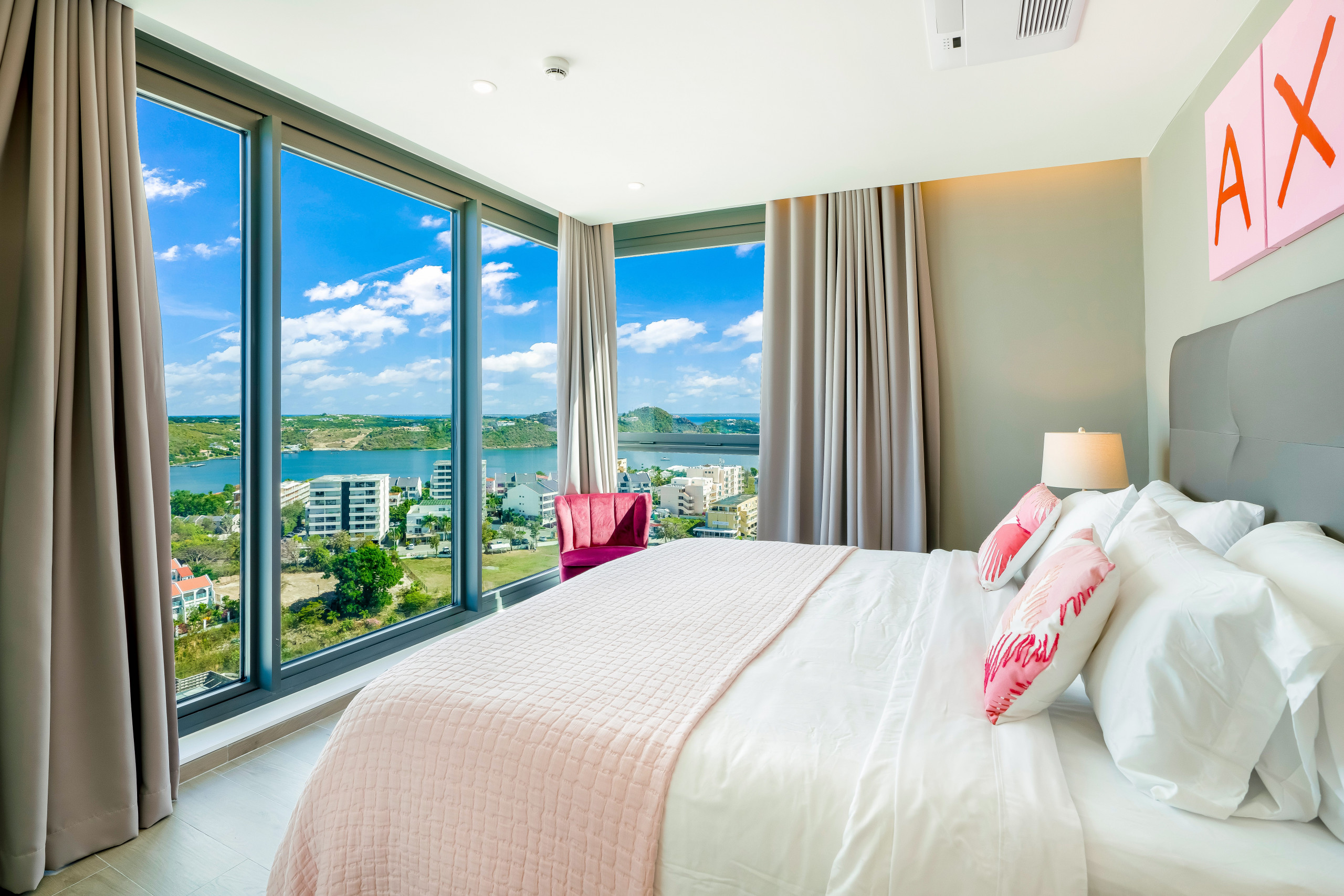 Situé au 19e étage, il s'agit du deuxième plus haut penthouse 3 chambres de l’immeuble. Il bénéficie de plafonds de 3,35 m et d’une vue panoramique spectaculaire sur Mullet Bay, l’océan et les collines verdoyantes des environs.
