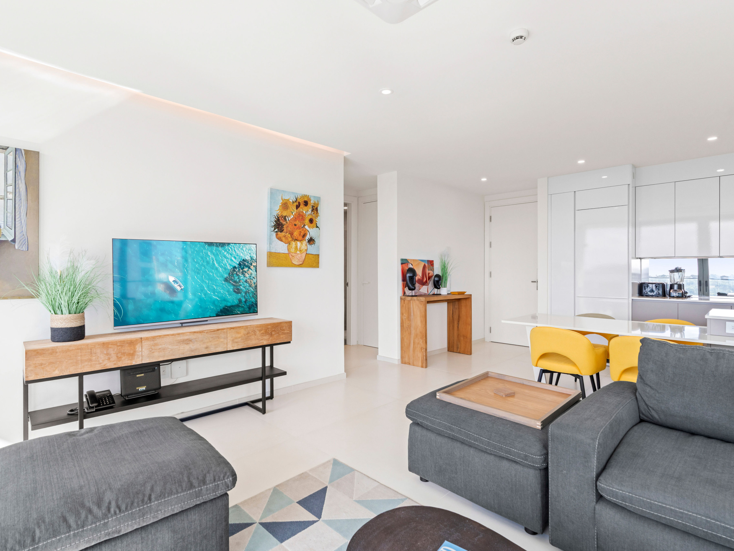 En entrant dans l'appartement, vous trouverez une bonne combinaison de meubles modernes ainsi qu'une toile réalisée par Espa, un artiste local de l'île. L'intérieur est lumineux et le salon principal face à l'océan présente un canapé super confortable et une télévision à écran plat. La salle à manger dispose d'une table design pouvant accueillir quatre personnes et d'une cuisine spacieuse entièrement équipée comprenant des ustensiles et des appareils tels qu'une plaque de cuisson à induction, un four micro-ondes, un four, un réfrigérateur avec congélateur et un lave-vaisselle.