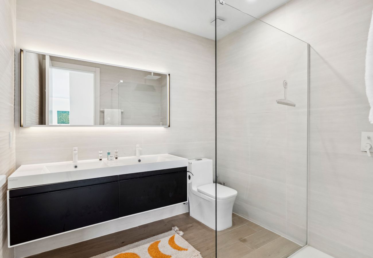 L'appartement dispose d'une salle de bains attenante bien aménagée, exhalant l'élégance et le raffinement. Profitez de la spacieuse douche à effet pluie ou offrez-vous un moment de bien-être avec la sélection d'aménagements de bain de luxe fournis. Vivez un instant de tranquillité et de rajeunissement, entouré d'installations raffinées et de finitions élégantes.