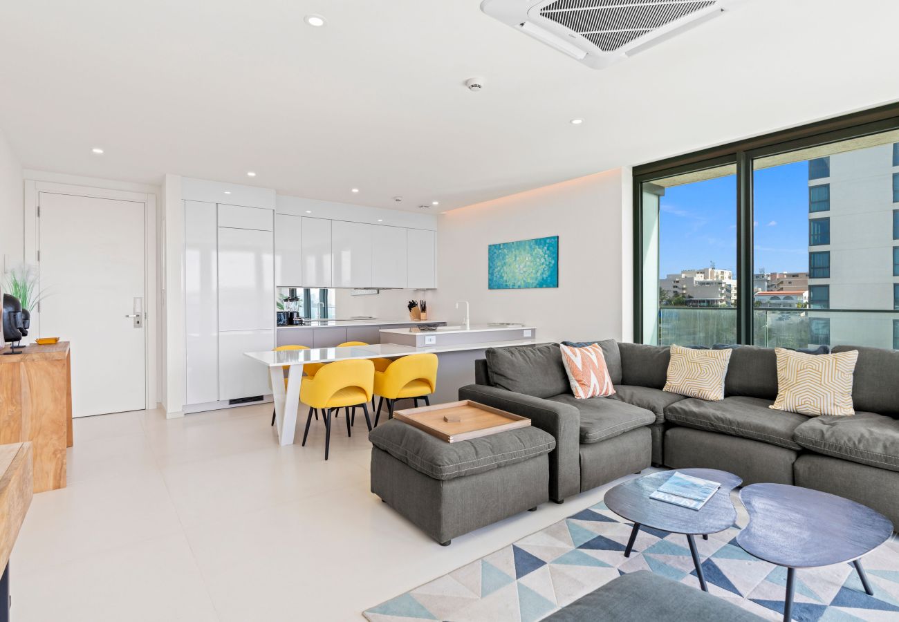 En entrant dans l'appartement, vous serez immédiatement captivé par l'harmonie entre l'élégance moderne et le charme côtier. Le salon à concept ouvert dispose de meubles raffinés et d'une décoration stylée, créant une ambiance sophistiquée qui complète parfaitement les vues imprenables à l'extérieur. La lumière du soleil pénètre par les grandes fenêtres, projetant une lueur chaude dans la pièce et mettant en valeur la vue remarquable sur la plage qui s'étend devant vous.