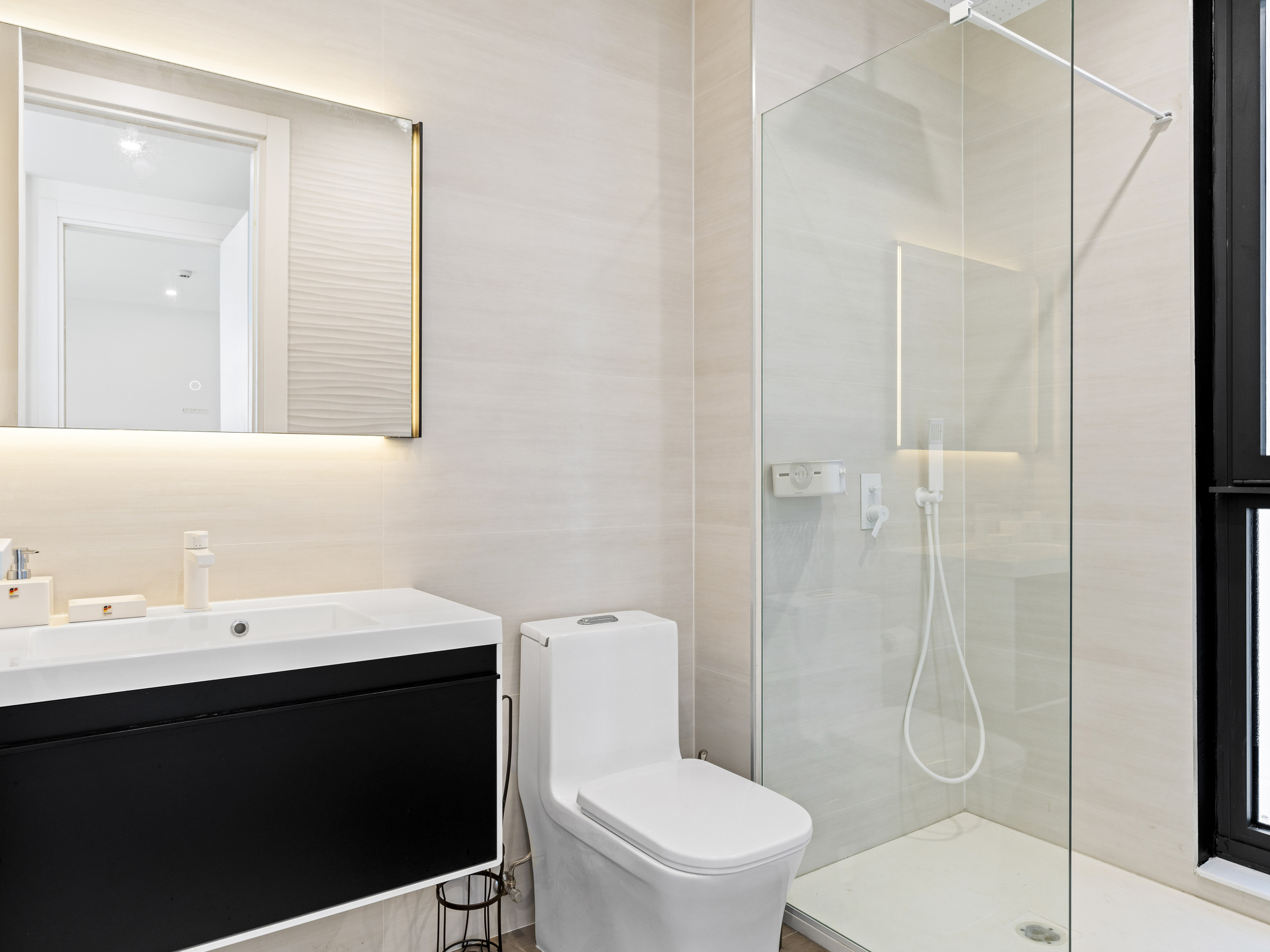 L'appartement dispose d'une salle de bains bien équipée, présentant des équipements modernes et des équipements luxueux. Prenez une douche rafraîchissante dans la spacieuse douche à effet de pluie à l'italienne, entourée de carrelage élégant et de finitions haut de gamme. Préparez-vous pour la journée ou détendez-vous le soir avec le plus grand confort et commodité.