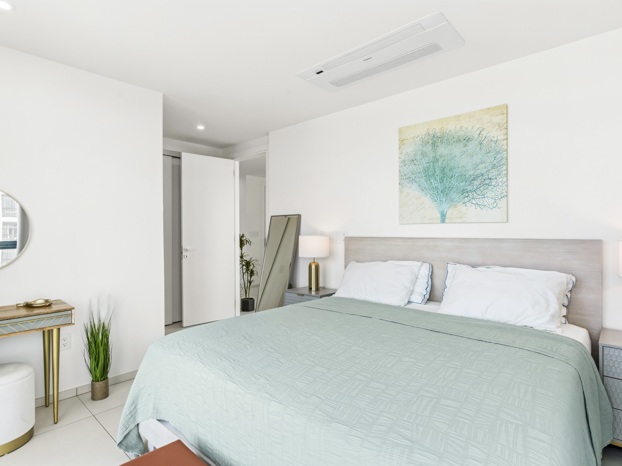 Lorsque vous entrez dans la chambre, les tons beiges / naturels de l'appartement vous mettront à l'aise.