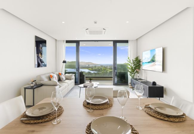 En entrant dans l'appartement, vous serez accueilli par un espace de vie spacieux et accueillant. Le salon meublé avec goût dispose de sièges confortables, vous permettant de vous détendre et de profiter de la vue fascinante sur la plage qui s'étend devant vous. Les baies vitrées inondent l'espace de lumière naturelle, créant une ambiance lumineuse et accueillante qui complète parfaitement l'environnement côtier.