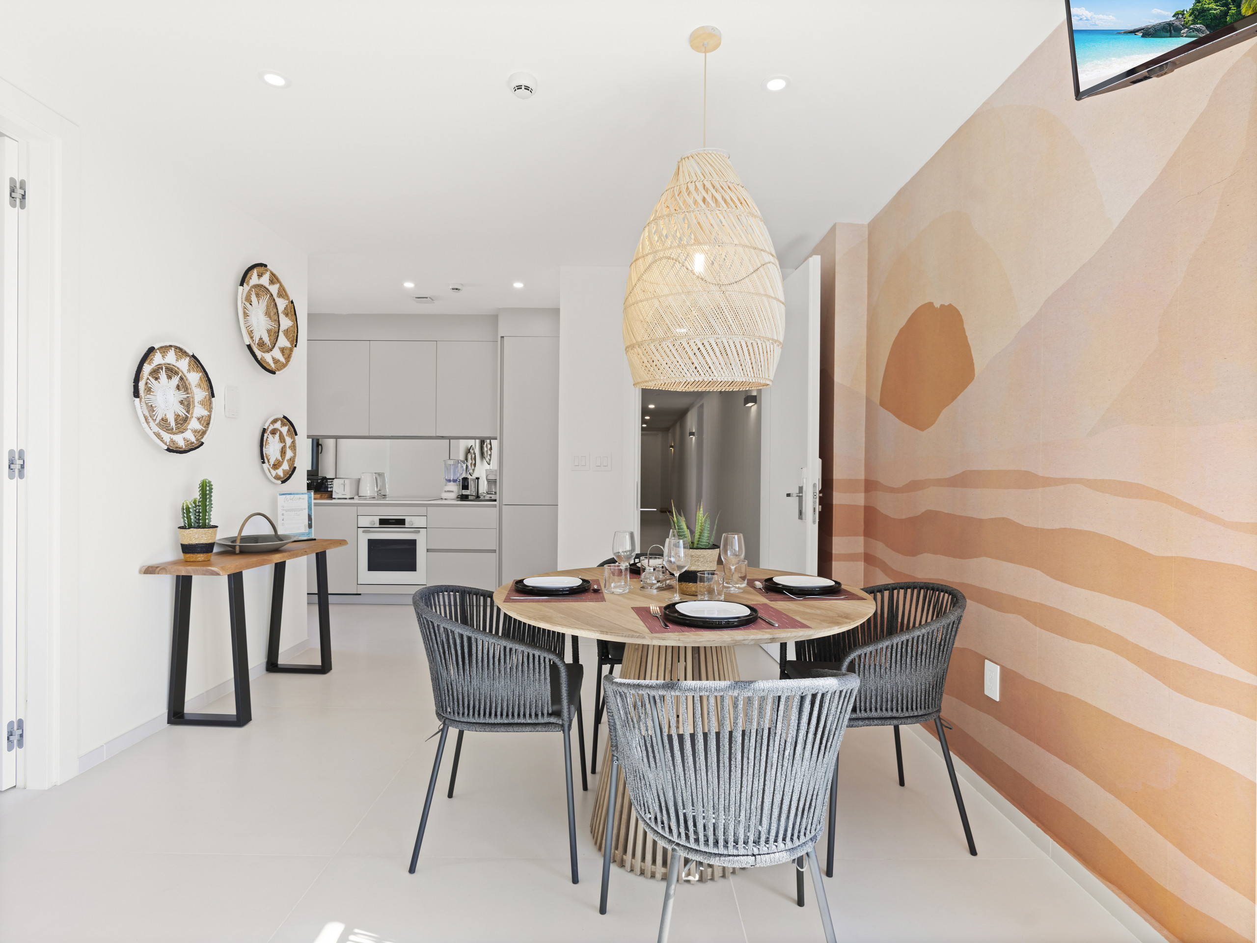 En entrant dans l'appartement, vous trouverez une bonne combinaison de meubles modernes ainsi qu'une toile réalisée par Espa, un artiste local de l'île. L'intérieur est lumineux et le salon principal face à l'océan présente un canapé super confortable et une télévision à écran plat. La salle à manger dispose d'une table design pouvant accueillir quatre personnes et d'une cuisine spacieuse entièrement équipée comprenant des ustensiles et des appareils tels qu'une plaque de cuisson à induction, un four micro-ondes, un four, un réfrigérateur avec congélateur et un lave-vaisselle.
