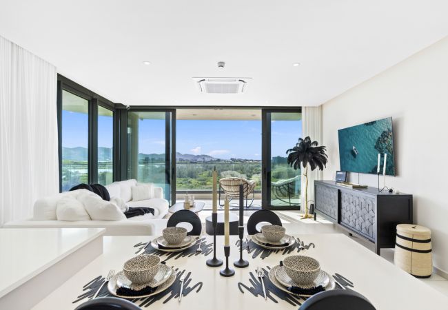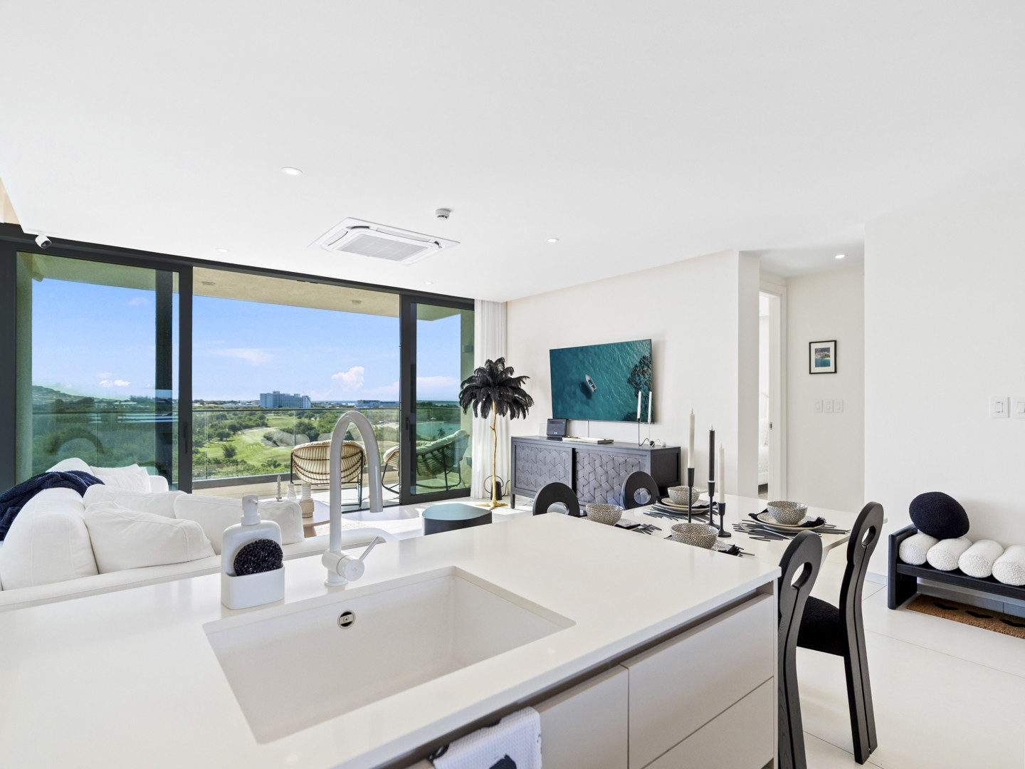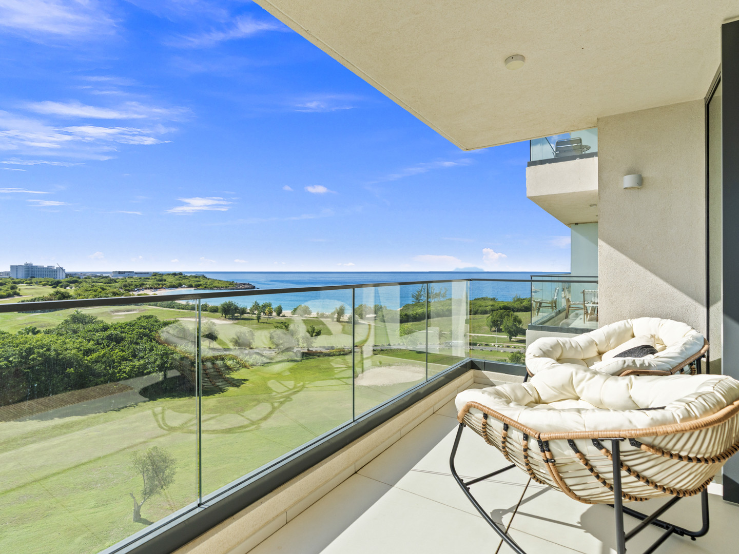 Bienvenue dans notre luxueux appartement d'une chambre, situé au septième étage, offrant une vue panoramique sur le golf et l’océan ainsi qu’un magnifique balcon. Préparez-vous à plonger dans un monde d’opulence et de tranquillité, où chaque détail a été soigneusement pensé pour créer un refuge côtier d’exception.