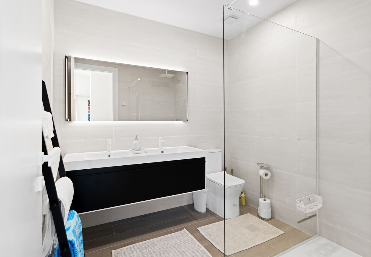 L'appartement dispose d'une salle de bains bien équipée, présentant des équipements modernes et des équipements luxueux. Prenez une douche rafraîchissante dans la spacieuse douche à effet de pluie à l'italienne, entourée de carrelage élégant et de finitions haut de gamme. Préparez-vous pour la journée ou détendez-vous le soir avec le plus grand confort et commodité.