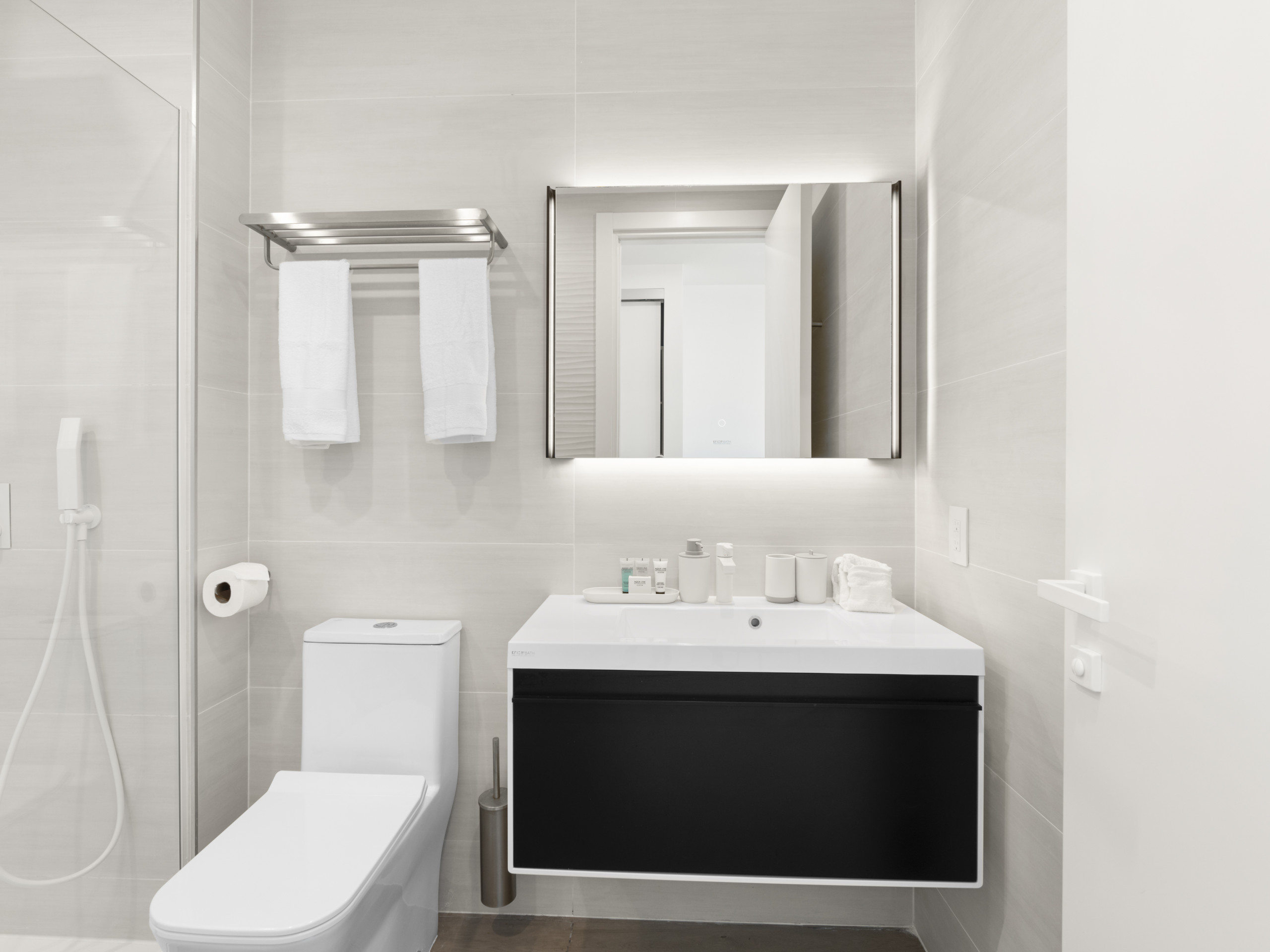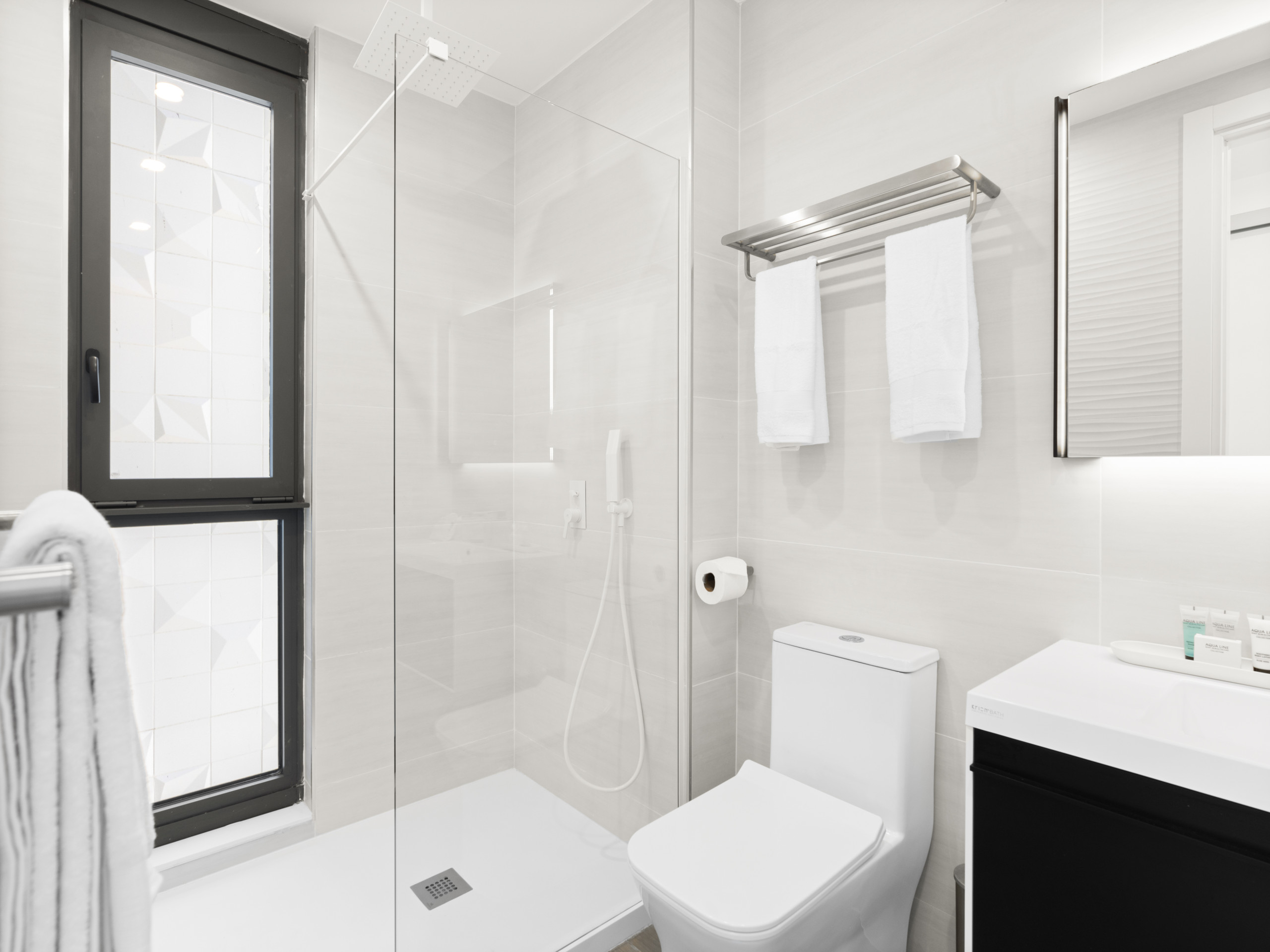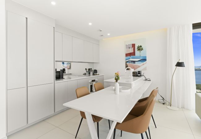 La cuisine américaine, à induction, est équipée avec réfrigérateur et congélateur.