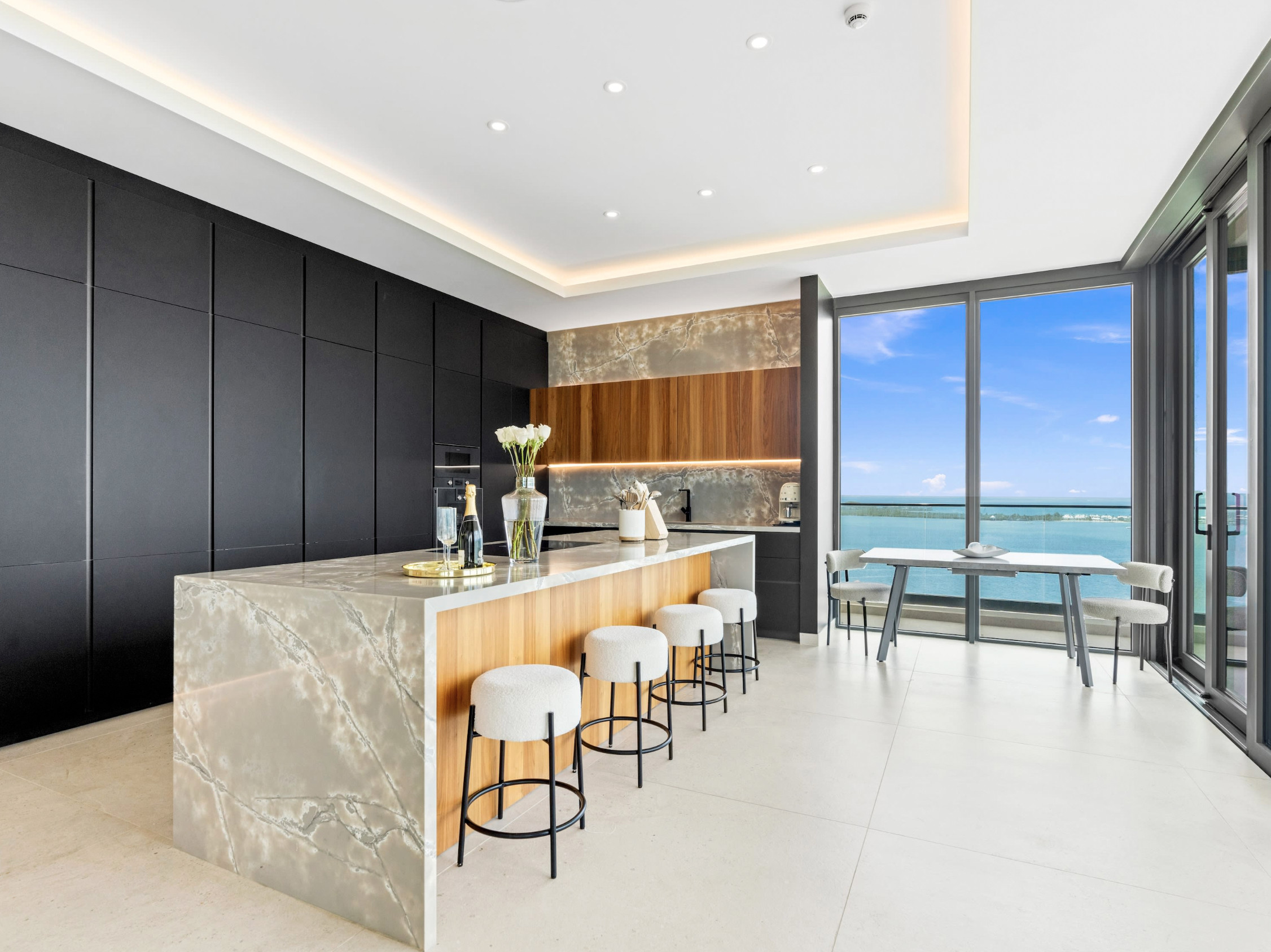 La cuisine américaine, à induction, est équipée avec réfrigérateur, micro-ondes, four, congélateur et lave-vaisselle.