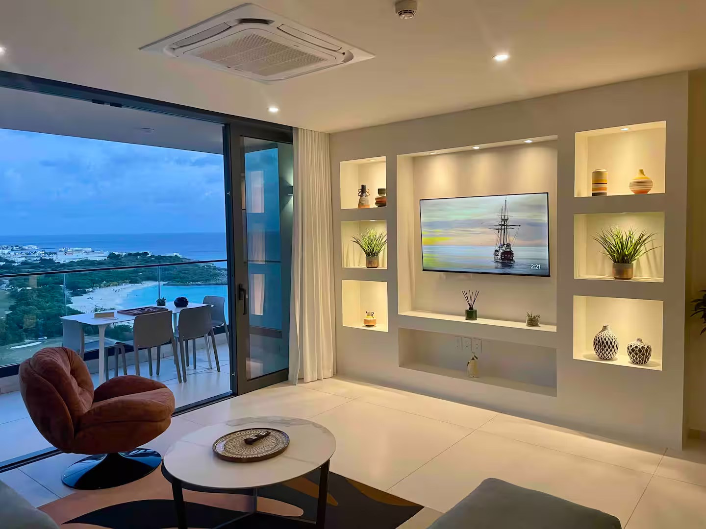 The accommodation is equipped with the following items: elevator, iron, air conditioning throughout the house, communal swimming pool, communal heated swimming pool, open-air parking in the same building, TV.