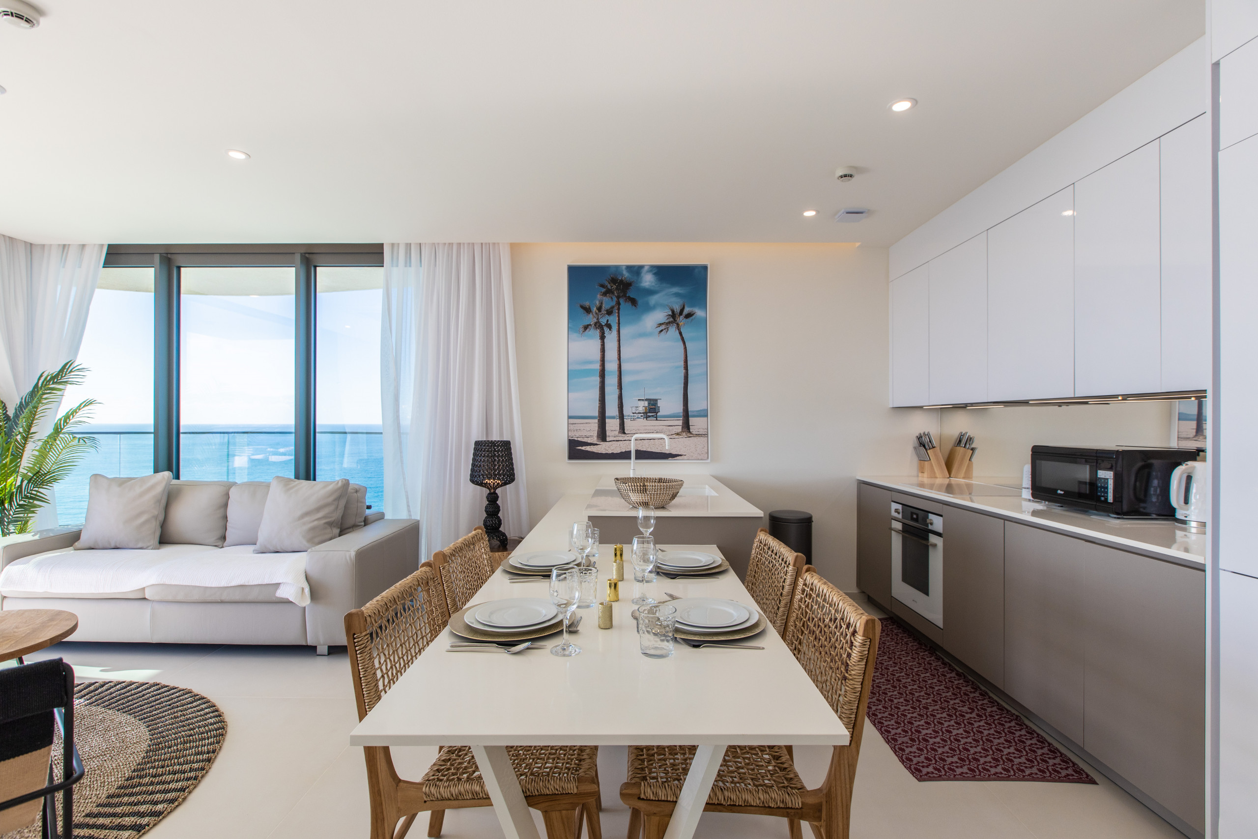 The apartment features a fully equipped gourmet kitchen, complete with top-of-the-line appliances and sleek countertops. Prepare culinary delights or casual meals while enjoying the magnificent beach view that serves as your culinary inspiration. The kitchen offers both functionality and style, ensuring that every meal preparation is a pleasurable experience.