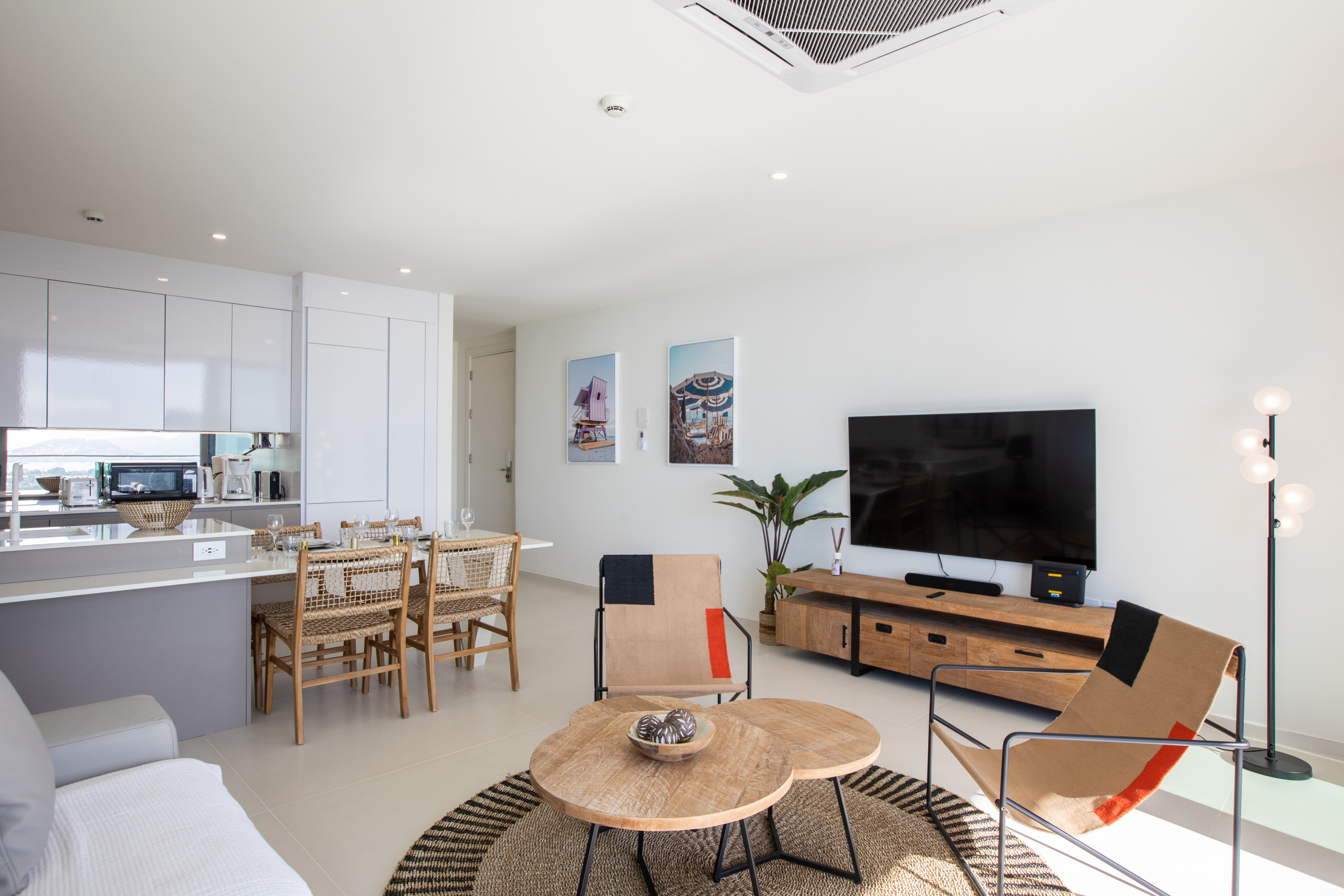 The living area is thoughtfully arranged to provide both relaxation and an uninterrupted view of the mesmerizing beach panorama. Sink into the plush seating, and let yourself be mesmerized by the ever-changing hues of the ocean. Adjacent to the living area, glass sliding doors lead you to a private balcony, where you can fully immerse yourself in the captivating coastal landscape. Bask in the gentle sea breeze, soak up the warm sun, and savor the idyllic ambiance of the beach view.