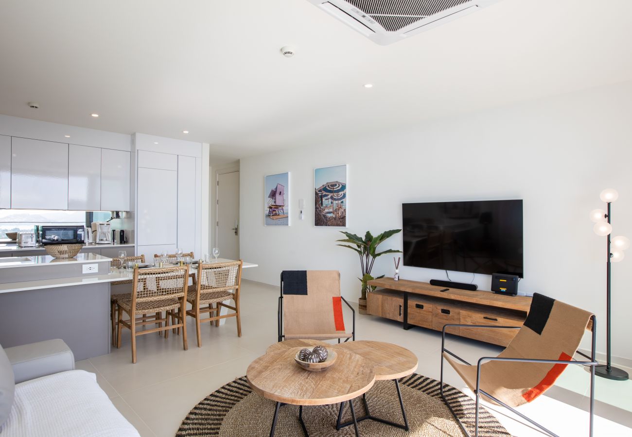 As you step into the apartment, you'll be immediately captivated by the stunning panoramic vistas of the beach through the expansive floor-to-ceiling windows. The corner location of this apartment allows for an abundance of natural light to flood the space, creating a bright and inviting ambiance that perfectly complements the coastal surroundings. The interior has been thoughtfully designed, combining modern elegance with a warm and welcoming atmosphere.