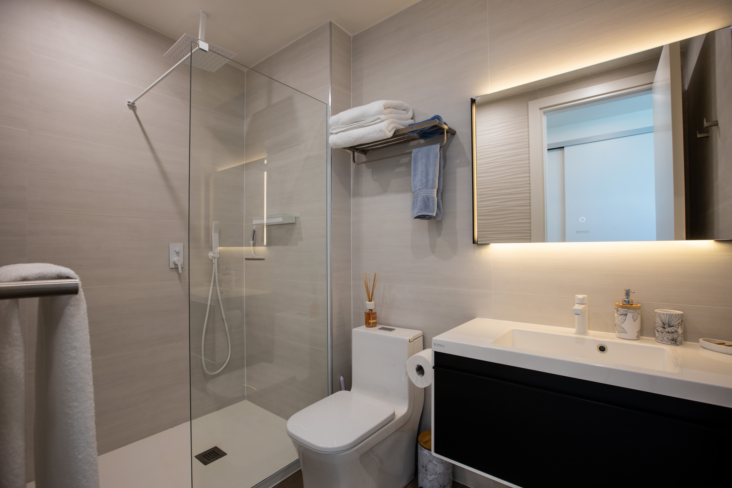 The apartment features elegantly designed bathrooms, equipped with modern fixtures, luxurious amenities, and sleek finishes. Indulge in a refreshing shower surrounded by an atmosphere of sophistication and serenity.