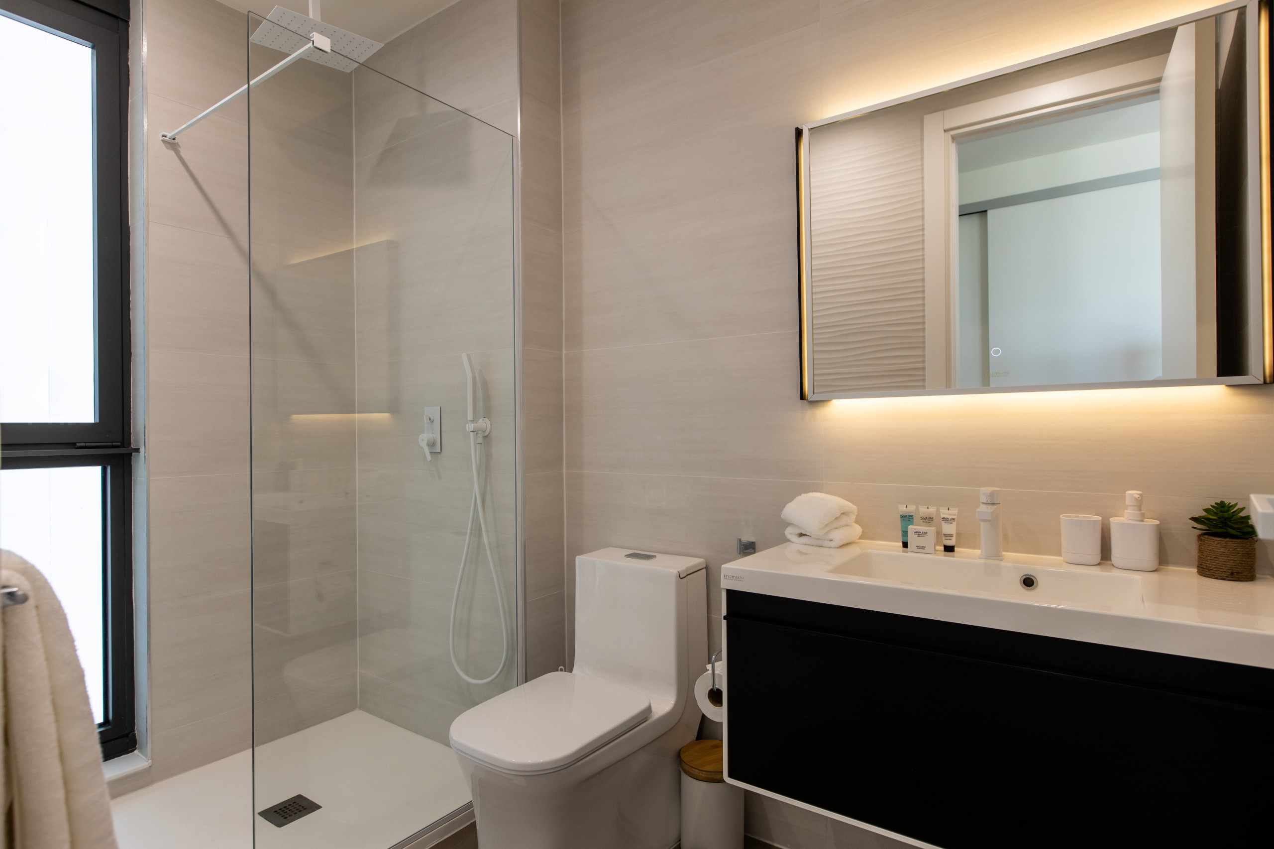 The apartment also boasts two well-appointed en-suite bathrooms, exuding refinement, and elegance. Indulge in the spacious walk-in rainfall showers, surrounded by modern fixtures and luxurious finishes. Each bathroom provides a sanctuary of relaxation, complete with premium amenities and plush towels.