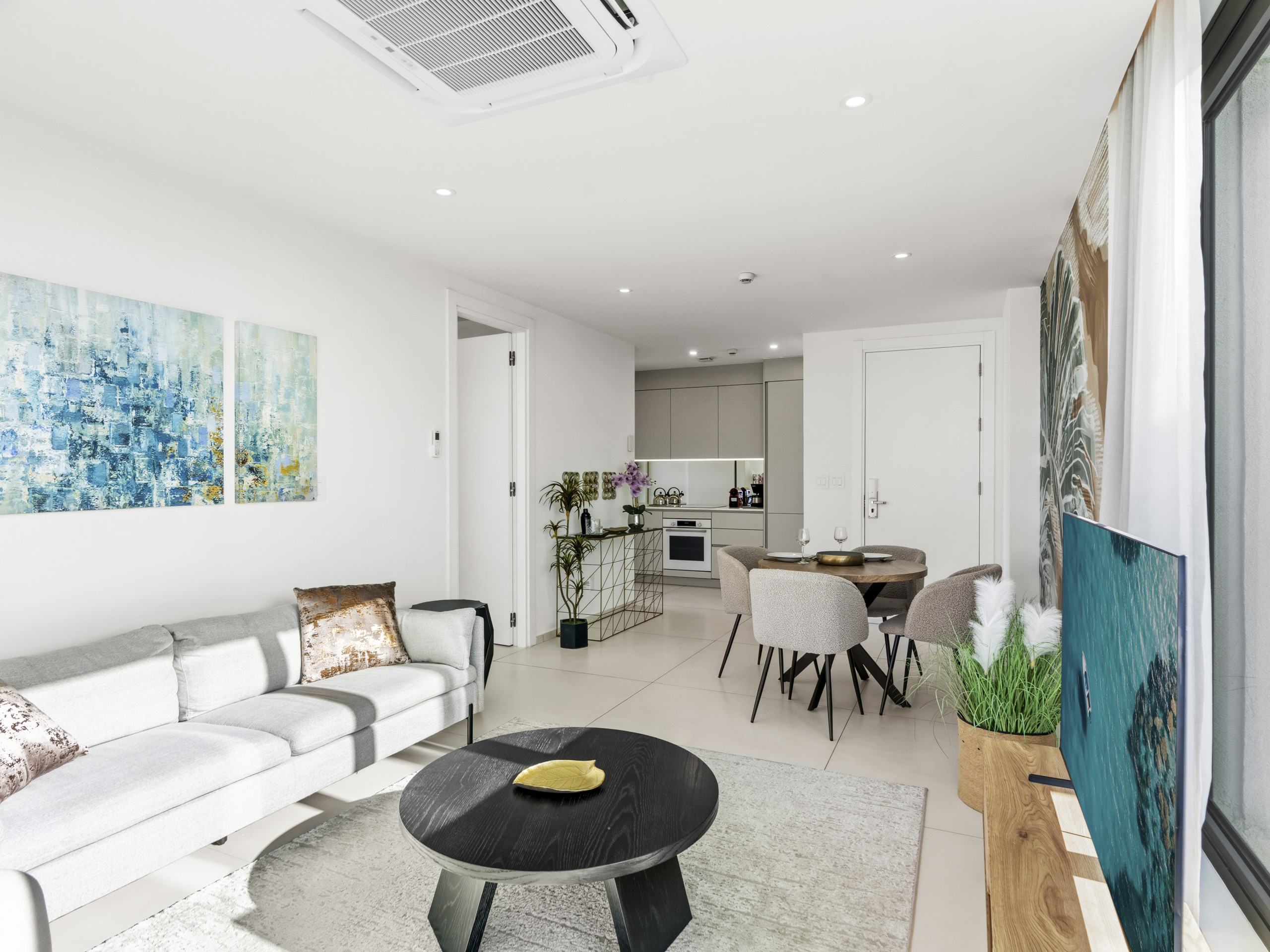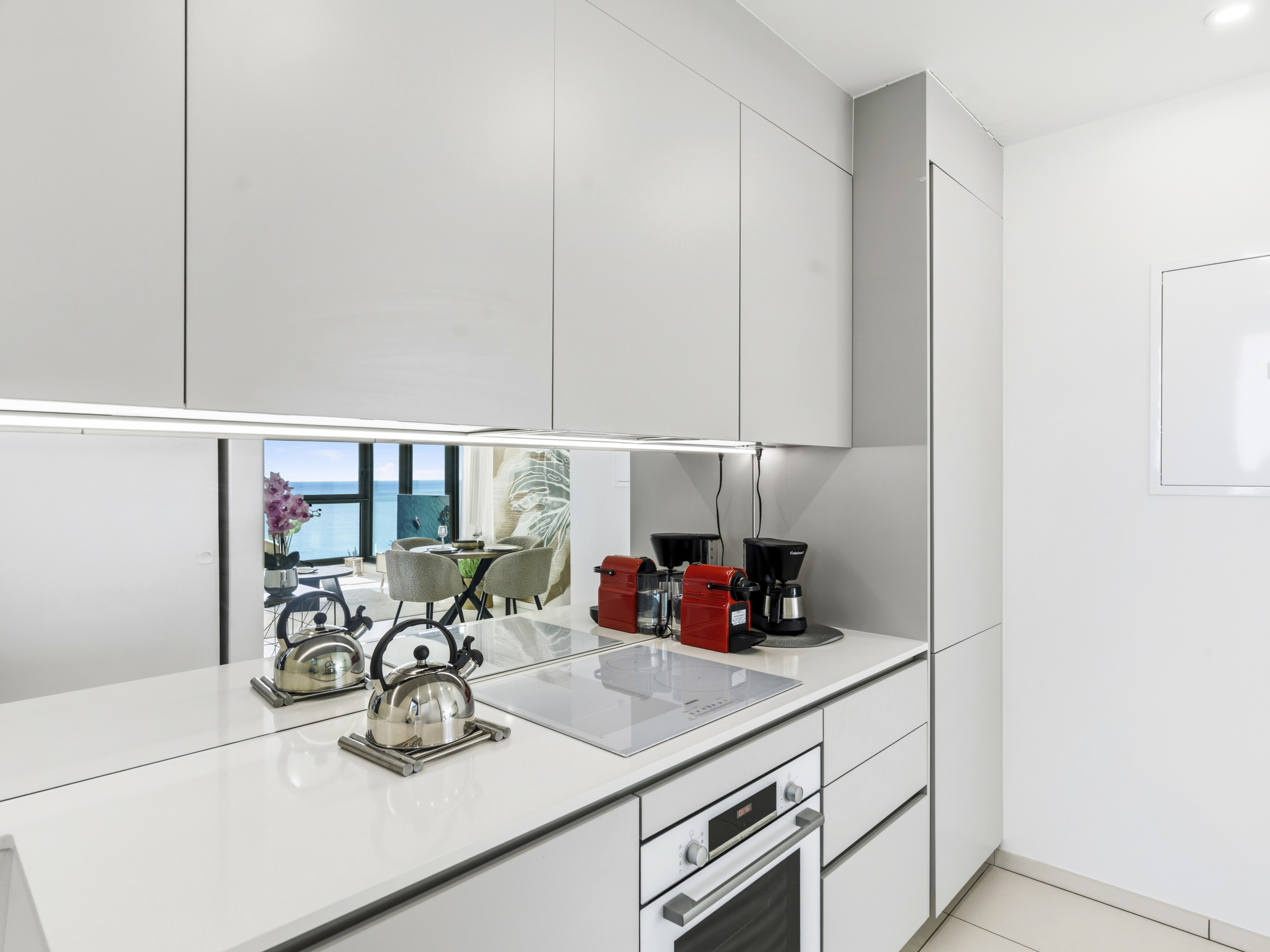 As you enter the apartment, you'll be greeted by a bright and spacious open-concept living area, adorned with tasteful furnishings and contemporary decor. The large windows allow an abundance of natural light to fill the space, creating a warm and inviting ambiance that complements the coastal surroundings. From the moment you step inside, you'll be captivated by the mesmerizing beach view that stretches before you.