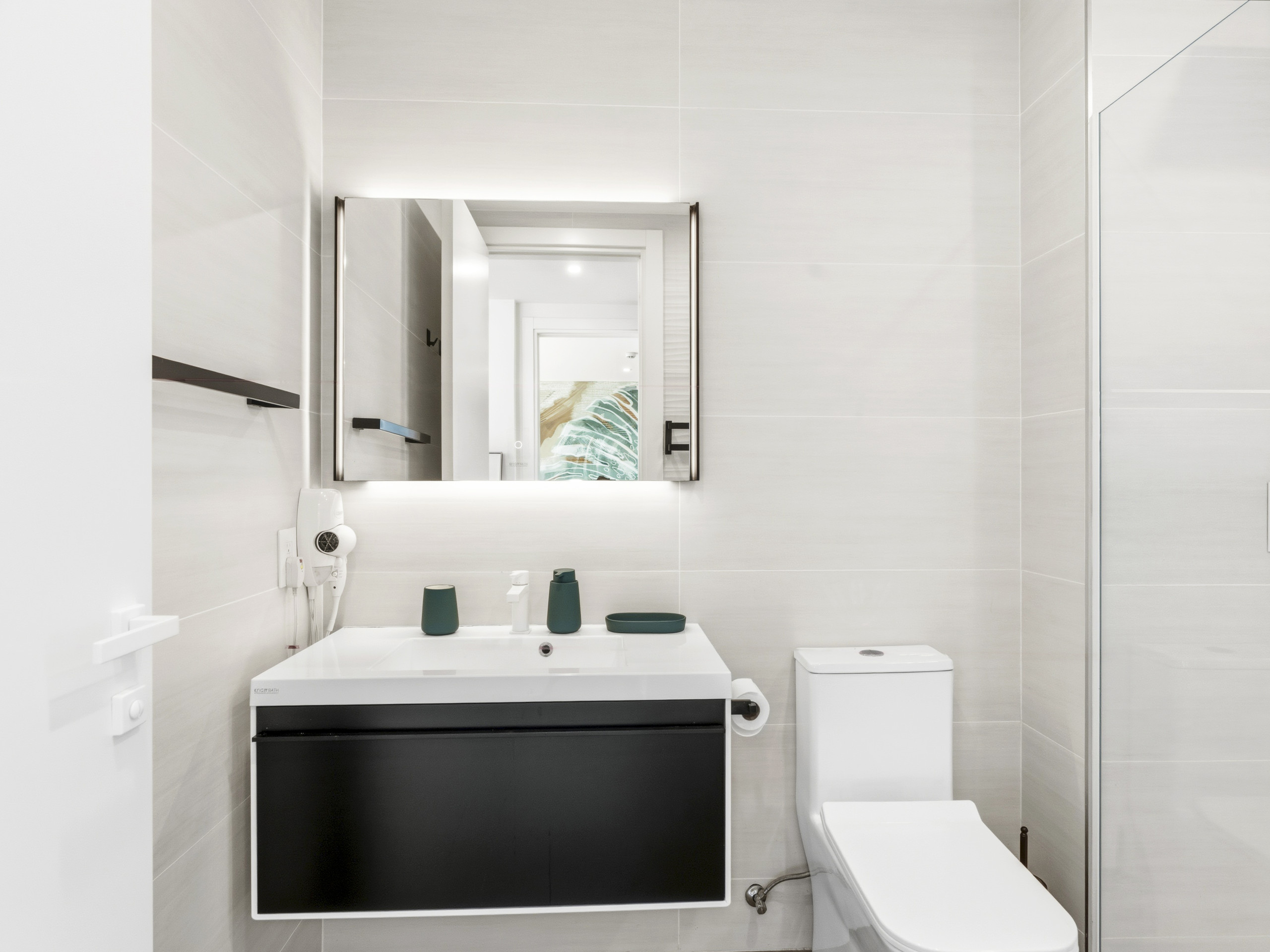 The apartment features a well-appointed bathroom, showcasing modern fixtures and luxurious amenities. Take a refreshing shower in the spacious walk-in rainfall shower, surrounded by sleek tile and premium finishes. Prepare for the day ahead or wind down in the evening with the utmost comfort and convenience.