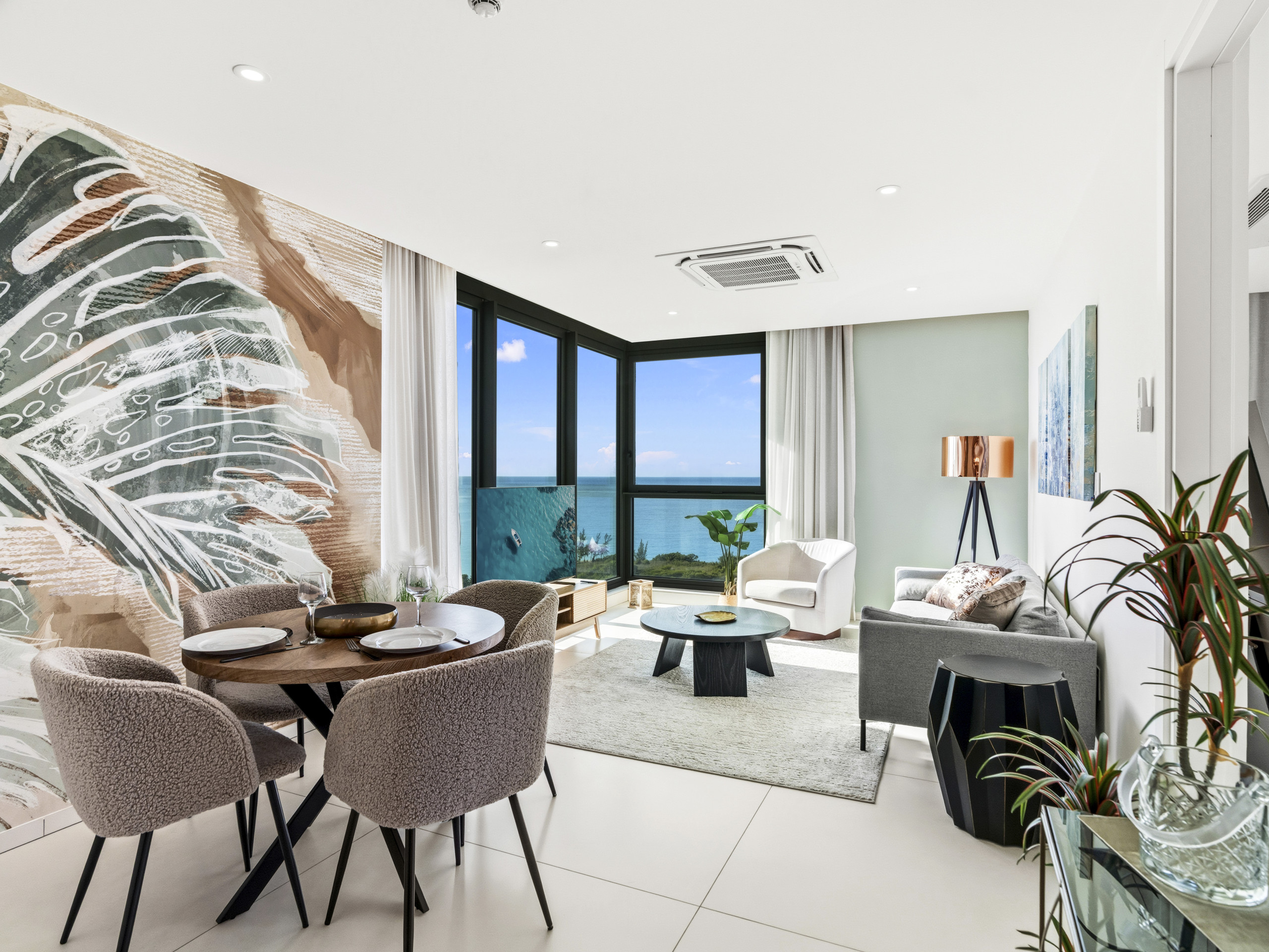 This intimate and elegant one bedroom apartment located on the 10th floor offers 59,4 square metres of refined living, just enough to free your mind for the perfect getaway trip to the islands. Several walls of pure glass bring you into direct view of the Caribbean sea, making you wonder if you ever need to leave your bed.