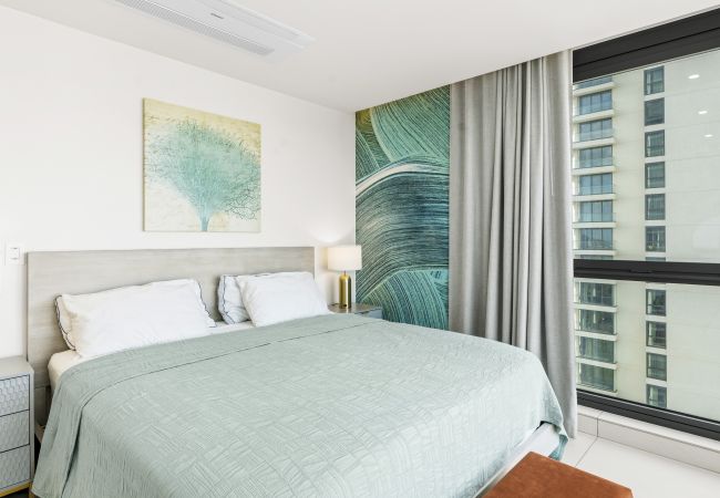 The luxurious bedroom provides a haven of comfort and serenity. The bed, adorned with premium linens and an array of plush pillows, ensures a restful night's sleep. Wake up to the soft glow of the morning sun, casting its golden rays across the room, and step onto the balcony to savor a cup of coffee or tea while being mesmerized by the breathtaking beach panorama that unfolds before you.