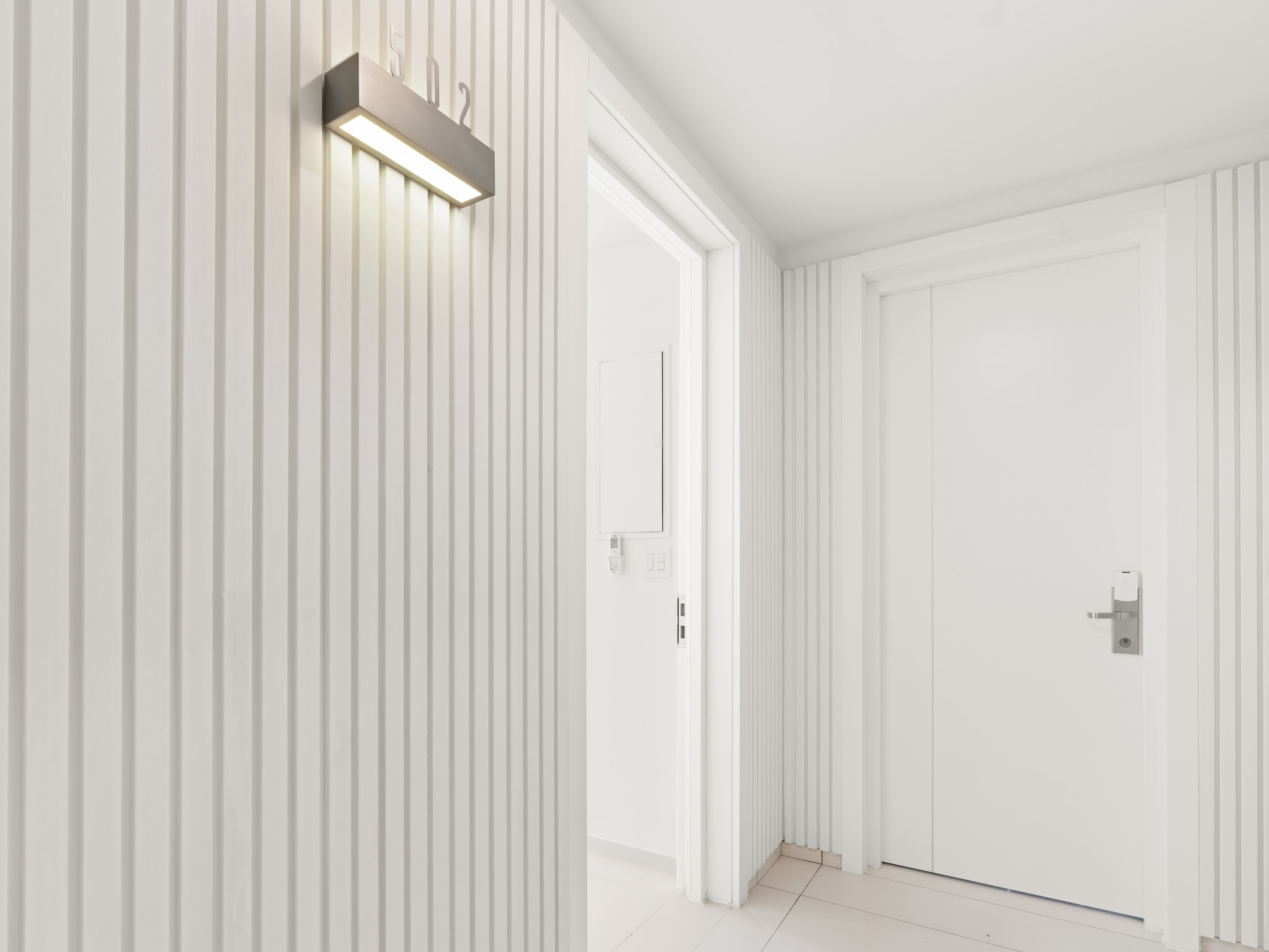 The apartment features a well-appointed bathroom, presenting modern amenities and luxurious fixtures. Enjoy a refreshing shower in the spacious Italian-style rain shower, surrounded by elegant tile and high-end finishes. Prepare for the day or unwind in the evening with the utmost comfort and convenience.