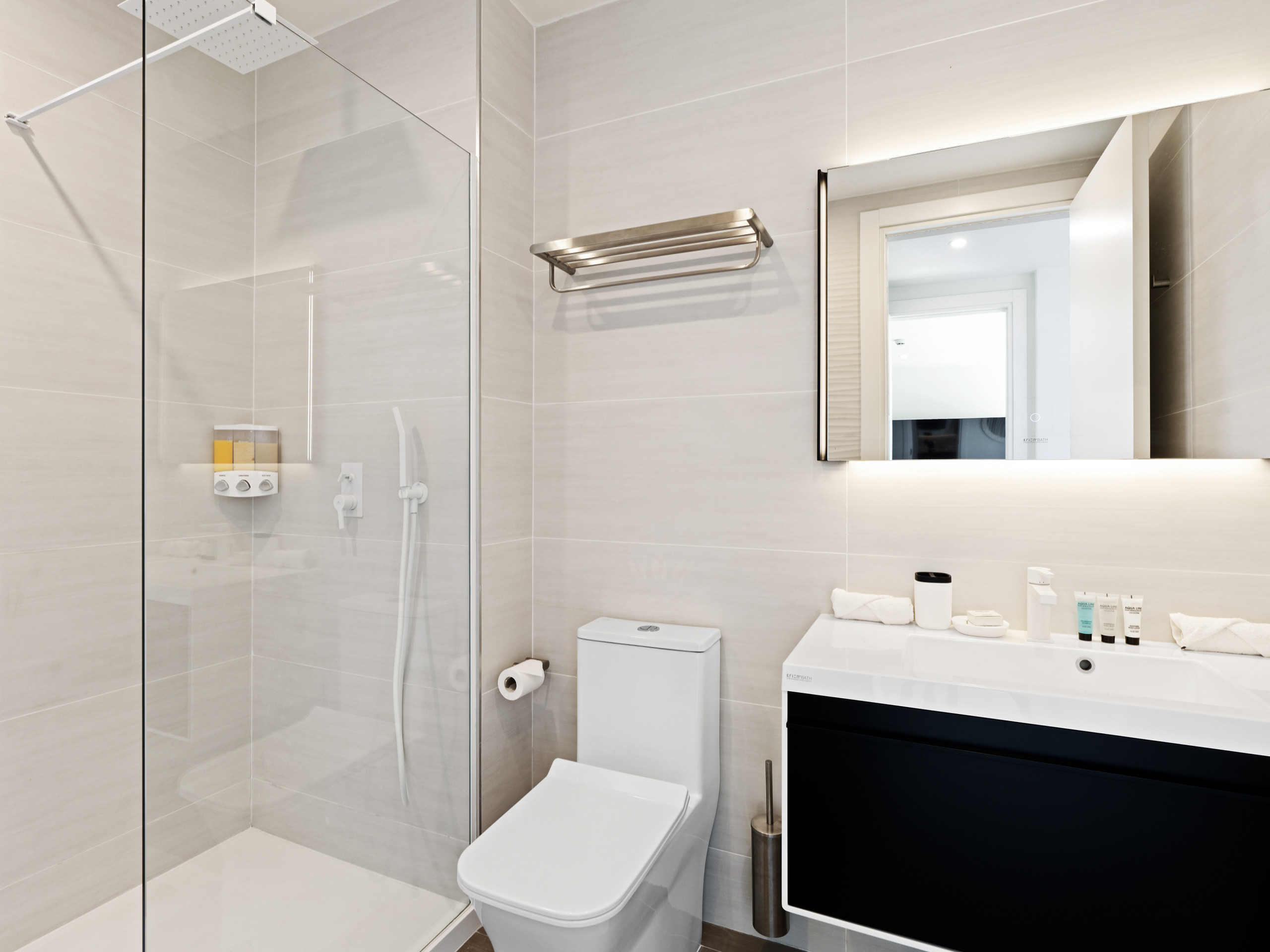 The apartment features a well-appointed bathroom, showcasing modern fixtures and luxurious amenities. Take a refreshing shower in the spacious walk-in rainfall shower, surrounded by sleek tile and premium finishes. Prepare for the day ahead or wind down in the evening with the utmost comfort and convenience.